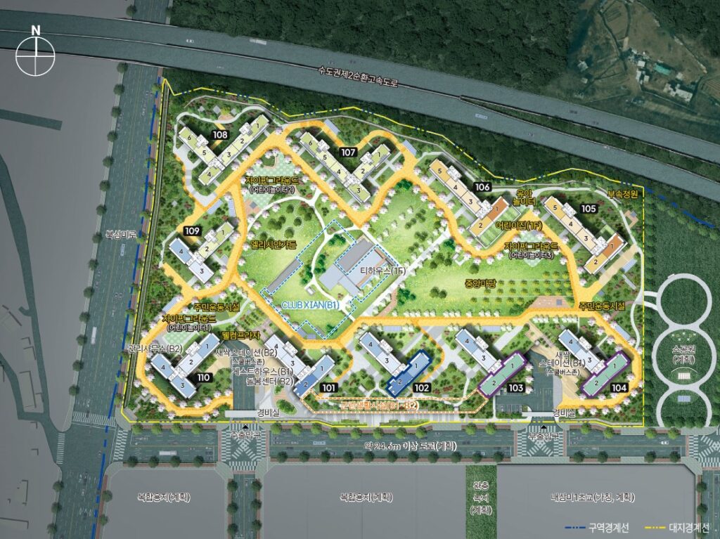 ※건물의 색채, 외관, 조경, 식재 및 보행로는 입주자의 이해를 돕기 위한 것으로 실제와 다소 차이가 있으며, 추후 인허가 과정 및 실제 시공 시 변경될 수 있습니다. 또한 구획선과 시설물의 위치 및 규모 역시 측량 결과 및 각종 평가에 따라 시공 시 변경될 수 있습니다.